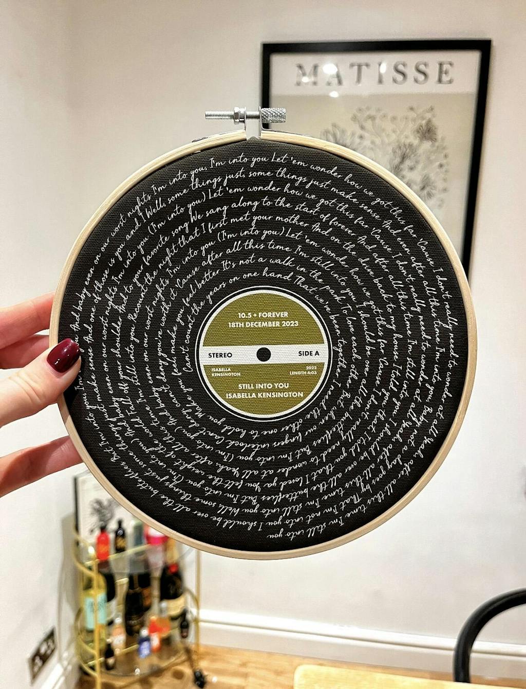The most popular ways to display this are to either rest it on a shelf or thread a ribbon through and hang on the wall.